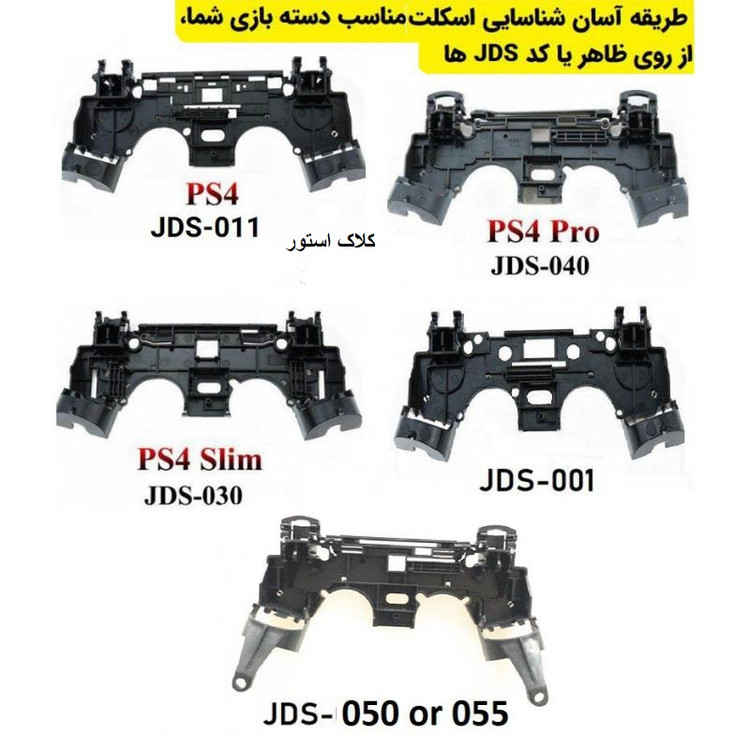 استخوانی یا اسکلت دسته (مدل 050 / 040 / 030 / 001 / 011 JDM) که داخل قاب دسته بازی PS4 می باشد و یکی از حساس ترین بخش های داخلی دسته بازی هستند که ریبون دسته روی آن قرار میگیرد و هرگونه شستگی و یا اسیب دیدگی در این اسکلت می تواند اختلال در جا افتادن اجزای داخل دسته بخصوص دکمه های جلوی دسته شود